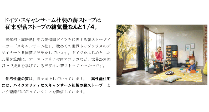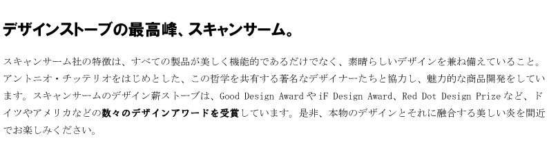 また、スキャンサーム社製の薪ストーブはすべて世界トップクラスのデザイナー商品でありますので、デザイナーの価値を損なわないためにも、定価での販売に限定させていただいております。
